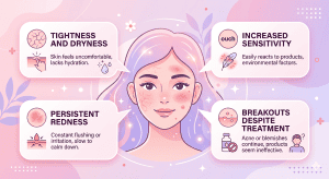 A compromised skin barrier leads to redness, sensitivity and breakouts. Overuse of actives like retinol, AHAs and BHAs without proper hydration can worsen the condition.