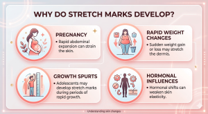 Stretch marks form when the skin is stretched beyond its natural elasticity. Common causes include: